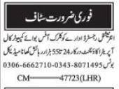 Educational qualifications required Intermediate, Master, Matric, Bachelor and Middle etc.