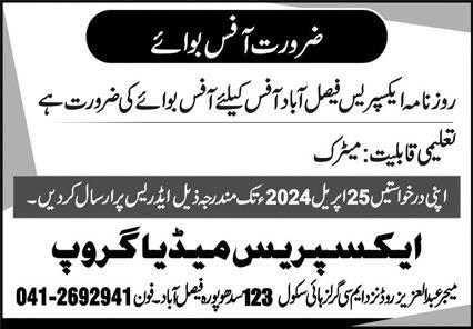 Express Media Group invites applications for job positions advertised in daily Express dated 19 April 2024 for following vacancies in Faisalabad, faisalabad Punjab Pakistan.