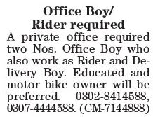 Private Office Lahore, lahore Punjab Pakistan invites applications from eligible candidates for the post of office boy, delivery boy and rider as per advertisement of April 17, 2024 published in daily The News Newspaper. Matric and Middle etc. educational qualification will be preferred.