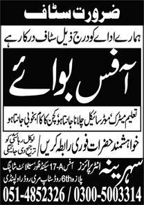 Sehrina Enterprises is looking for candidates for following posts as per job advertisement published in daily Express Newspaper of November 10, 2024 for location Rawalpindi, rawalpindi Punjab Pakistan: