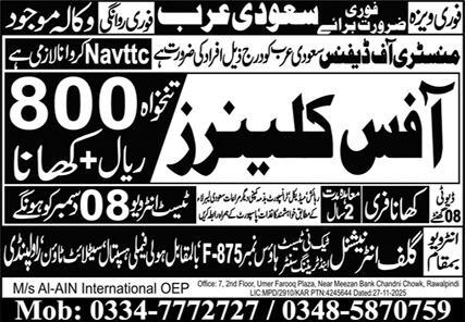 Al Ain International Overseas Employment Promoter is looking for candidates for following posts as per job advertisement published in daily Express Newspaper of December 7, 2025 for location Riyadh, riyadh Saudi Arabia: