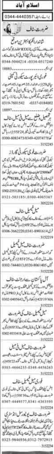 Vacant posts including accounts manager, subedar, public relation officer, computer call operator, clerk computer, sipahi, security supervisor, havaldar, security manager, security guard, computer operator, female office staff, helper, call operator, accountant, office staff, naib subedar, office manager, receptionist, office boy, manager and clerk are announced in Private Company Islamabad, rawalpindi Islamabad Pakistan as per 31 May 2022 advertisement in daily Dunya Newspaper. Persons with Middle, Bachelor, Intermediate and Matric etc. education can apply.