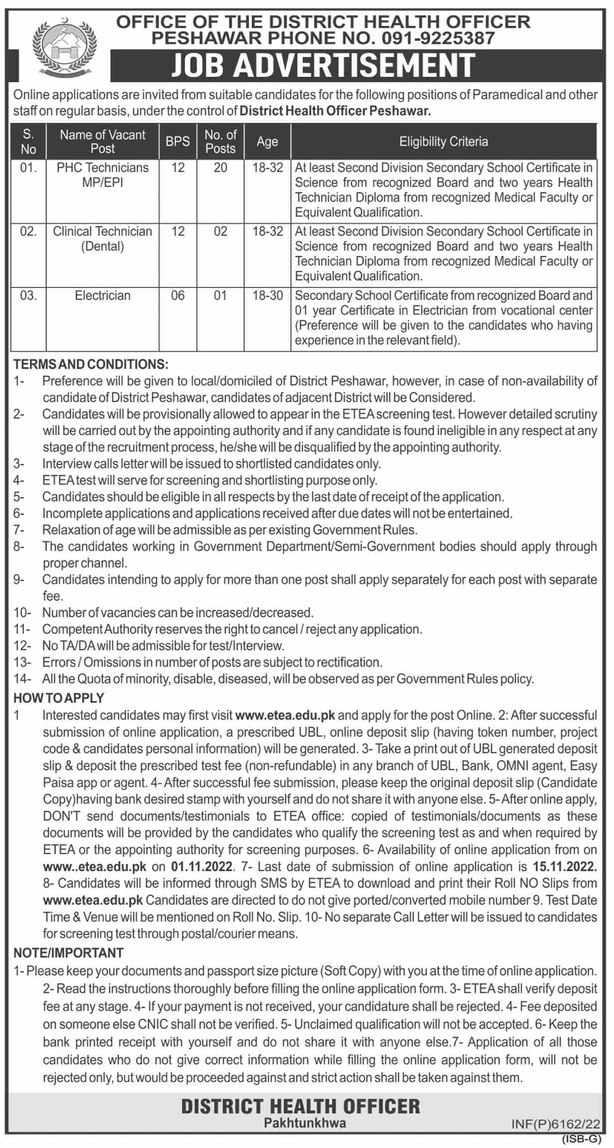 Office of District Health Officer is looking for candidates for following posts as per job advertisement published in daily Dawn Newspaper of October 26, 2022 for location Peshawar, peshawar Khyber Pakhtunkhwa KPK Pakistan: