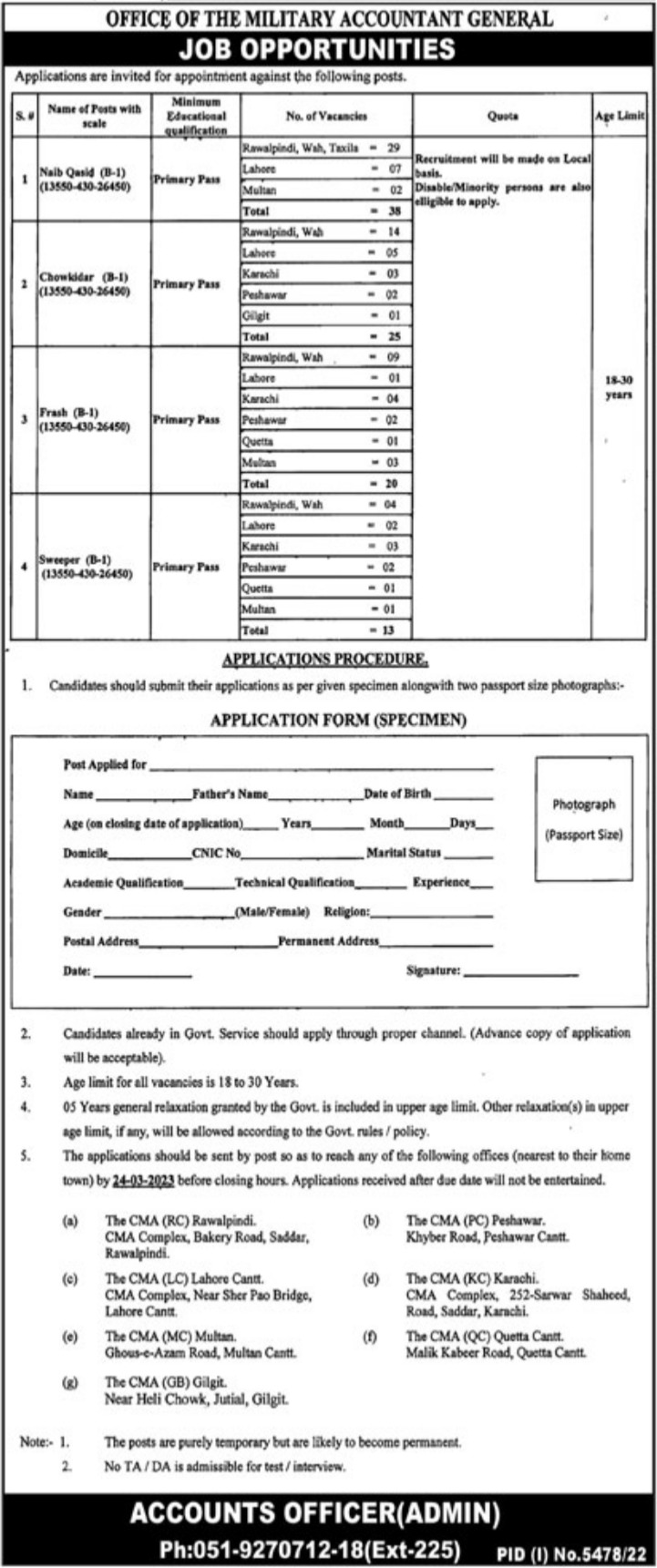 Office of The Military Accountant General jobs advertisement dated about 5 March 2023 in daily Khabrain Newspaper invites application for the vacant post of sweeper, chowkidar, naib qasid and frash in Rawalpindi, karachi, quetta, peshawar, lahore and gilgit Punjab Pakistan. Primary etc. educational qualification will be preferred.