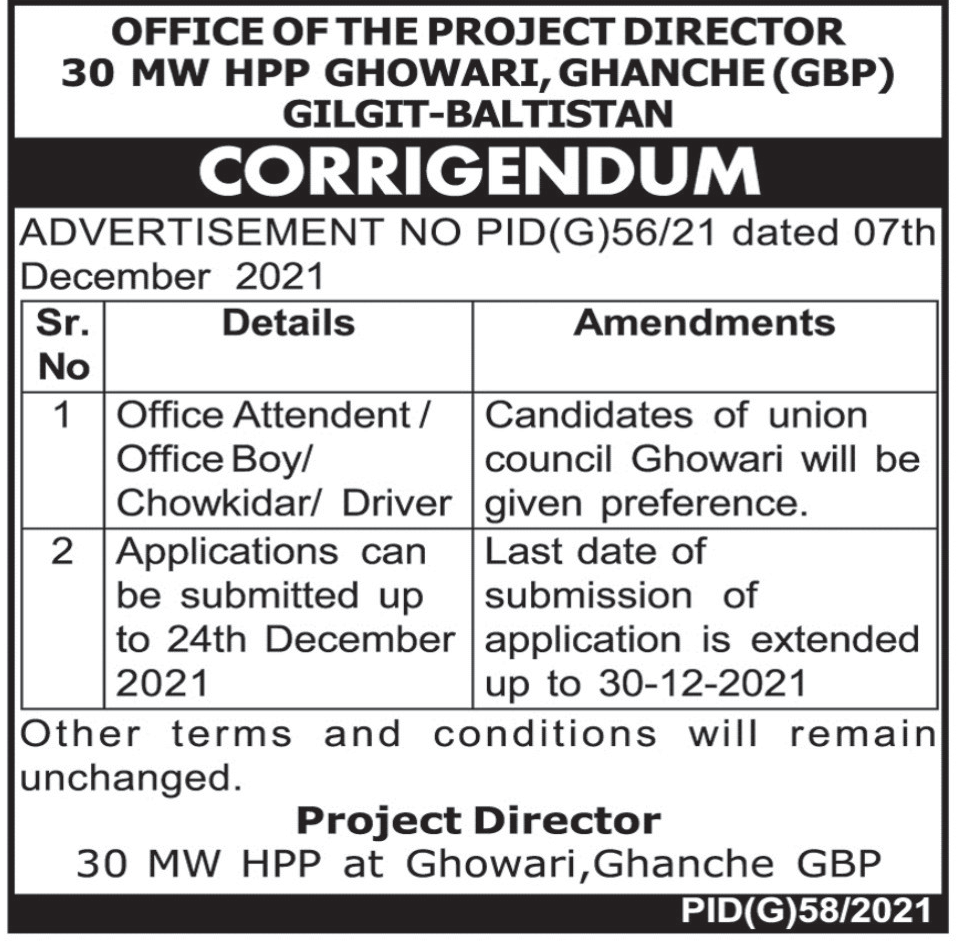 Office of the Project Director 30 MW HPP Ghowari, Ghanche GBP Gilgit Baltistan amendments in the previous advertisement which were published on 07th December 2021 in which last date were mentioned 24th December 2021 but now department have changed into 30th December 2021 and candidate of union council Ghowari will be given Preference.