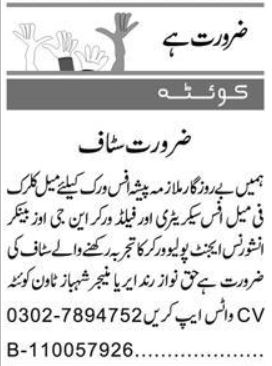 Private Organization is looking for candidates for following posts as per job advertisement published in daily Express Newspaper of August 20, 2024 for location Quetta, quetta Balochistan Pakistan: