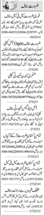 Private Islamabad, islamabad Islamabad Pakistan invites applications from eligible candidates for the post of retired air force staff, clerk, retired rangers staff, managements staff, manager, retired subedar, office boy, retired naik, helper, office staff, retired navy staff, call computer operator, retired naib subedar, call operator, security guard, retired havaldar, accountant, male female staff, security supervisor, retired government staff, retired subedar major and pro as per advertisement of March 27, 2023 published in daily Dunya Newspaper. Persons with Bachelor, Master, Matric, Intermediate and Middle etc. education can apply.