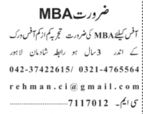Private Organization Lahore, lahore Punjab Pakistan invites applications from eligible candidates for the post of office staff as per advertisement of May 9, 2022 published in daily Jang Newspaper. Master and MBA etc. educational qualification will be preferred.