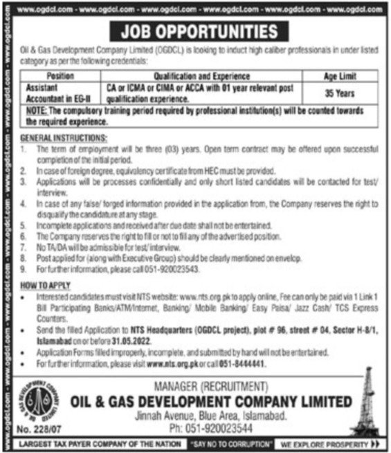 Oil & Gas Development Company Limited OGDCL Islamabad, islamabad Islamabad Pakistan invites applications from eligible candidates for the post of assistant accountant as per advertisement of May 12, 2022 published in daily Mashriq Newspaper. Persons with ACCA and CA etc. education can apply.