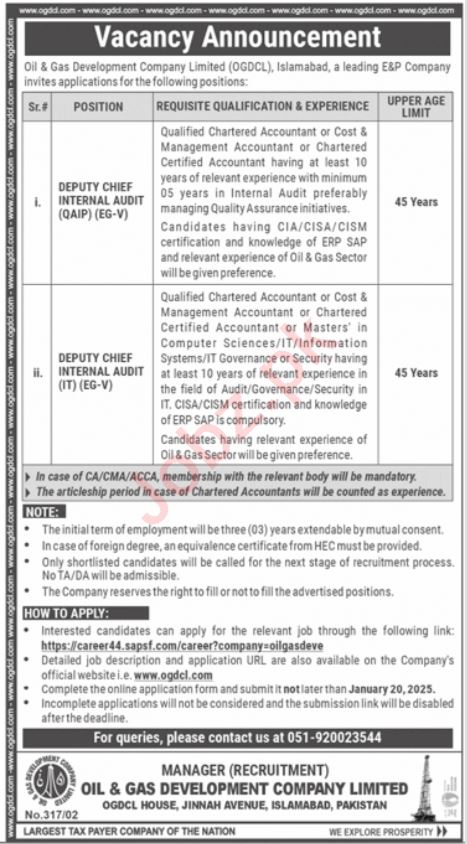 Vacant posts including deputy chief internal audit are announced in Oil & Gas Development Company Limited OGDCL Islamabad, islamabad Islamabad Pakistan as per 5 January 2025 advertisement in daily Jang Newspaper. Preferred Education is CA, Master, ACCA and MBA etc.