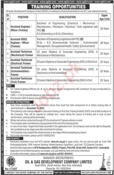 Vacant posts including assistant hseq engineer, assistant technician, assistant engineer and assistant technician civil are announced in Oil & Gas Development Company Limited OGDCL Islamabad, islamabad Islamabad Pakistan as per 23 October 2022 advertisement in daily Jang Newspaper. Candidates with MS, Master and Bachelor etc. educational background will be preferred.