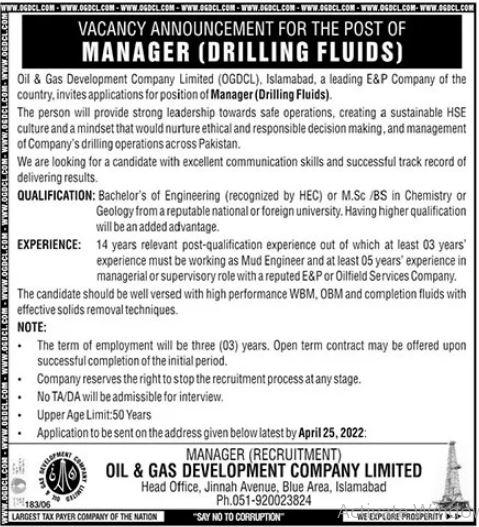 OGDCL Islamabad Manager Drilling Fluids Jobs 2022