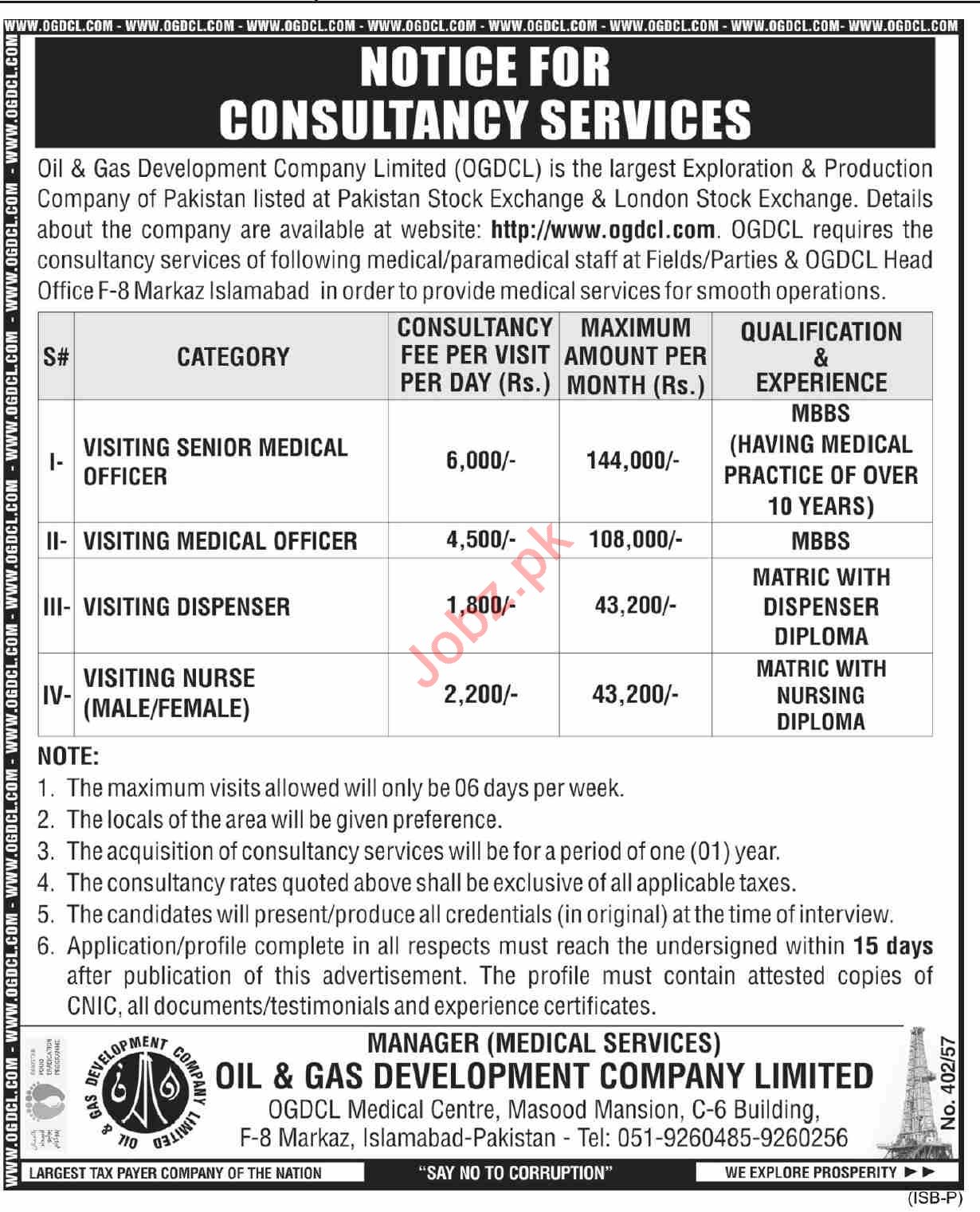 Oil & Gas Development Company Limited OGDCL Islamabad, Government of Pakistan is looking for the services from experienced candidates for the posts of Visiting Medical Officer, Visiting Senior Medical Officer, Medical Officer, Visiting Dispenser, Dispenser, Visiting Nurse, Nurse, Male Nurse.