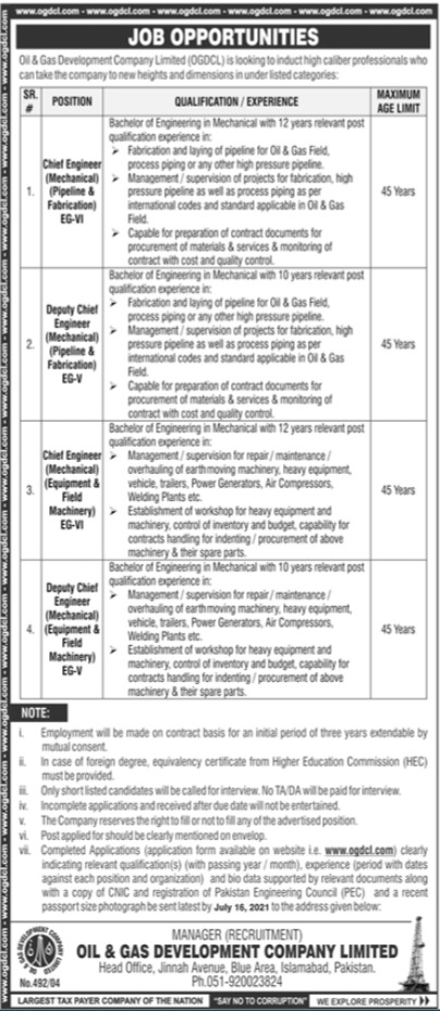 Oil and Gas Development Company Limited OGDCL invites applications from experienced and technical candidates for the posts of Chief Engineer Mechanical, Deputy Chief Engineer Pipeline, Deputy Chief Engineer Fabrication, Chief Engineer Equipment and Deputy Chief Engineer Field Machinery in Islamabad.
