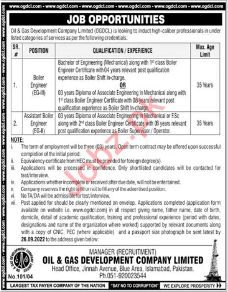 Vacant posts including assistant boiler engineer and boiler engineer are announced in Oil & Gas Development Company Limited OGDCL Islamabad, islamabad Islamabad Pakistan as per 11 September 2022 advertisement in daily Jang Newspaper. Bachelor, B.E and DAE etc. educational qualification will be preferred.