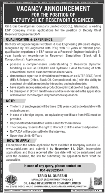 Oil & Gas Development Company Limited OGDCL invites applications for job positions advertised in daily Jang dated 27 October 2024 for following vacancies in Islamabad, islamabad Islamabad Pakistan.
