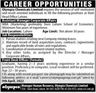 Olympia Chemicals Limited invites applications for job positions advertised in daily Jang dated 27 March 2022 for following vacancies in Lahore, lahore Punjab Pakistan.