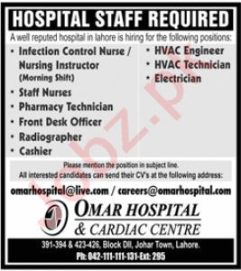 Omar Hospital jobs advertisement dated about 24 December 2023 in daily Jang Newspaper invites application for the vacant post of Front Desk Officer, Infection Control Nurse, Staff Nurse, Electrician, Pharmacy Technician, Hvac Engineer, Cashier, Hvac Technician, Nursing Instructor and Radiographer in Lahore, lahore Punjab Pakistan. Preferred Education is Matric, Middle, Intermediate and Bachelor etc.
