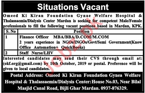 A leading and progressive Omeed Ki Kiran Foundation Gynae Welfare Hospital & Thalassaemia / Dialysis Center is seeking applications from competent and well educated candidates for the posts of Finance Officer, Staff Nurse & Lady Health Visitor LHV in Mardan KPK 2019.