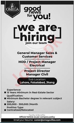 Omega Villas invites applications for job positions advertised in daily Jang dated 5 March 2023 for following vacancies in Lahore, lahore Punjab Pakistan.
