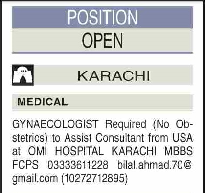 Vacant posts including gynaecologist are announced in OMI Hospital Karachi, karachi Sindh Pakistan as per 29 October 2022 advertisement in daily Dawn Newspaper. Preferred Education is MBBS etc.