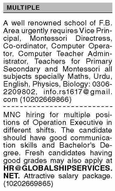 Private Company Karachi, karachi Sindh Pakistan invites applications from eligible candidates for the post of physics teacher, maths teacher, montessori directress, computer teacher, primary teacher, urdu teachere, computer operator, coordinator, operation executive, vice principal, english teacher, administrator and bio teacher as per advertisement of May 8, 2022 published in daily Dawn Newspaper. Educational qualifications required Bachelor, B.ed and Master etc.