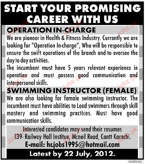 Operation Incharge, Swimming Instructor Job Opportunity