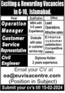 Vacant posts including customer service representative, operation manager and civil engineer are announced in Private Company Islamabad, islamabad Islamabad Pakistan as per 11 February 2024 advertisement in daily Jang Newspaper. Persons with DAE, MBA and Bachelor etc. education can apply.