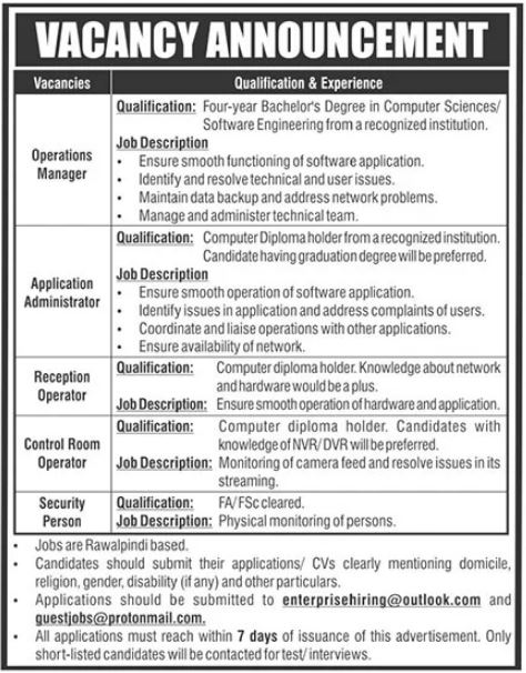 Apply as per details in job advertisement. Login to view further details of how to apply via https://www.jobz.pk online.