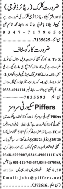 Private Company Lahore, sialkot, lahore and gujranwala Punjab Pakistan invites applications from eligible candidates for the post of security guard, operation supervisor, counter booking staff, telephone operator, sales staff, loader, cargo staff, clerk, marketing staff, driver, fauji clerk and courier boy as per advertisement of July 29, 2023 published in daily Jang Newspaper. Persons with Intermediate, Matric, Bachelor and Middle etc. education can apply.