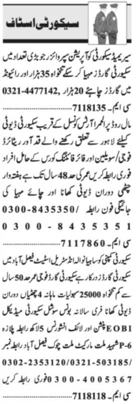 Vacant posts including security staff, security guard, operation supervisor and security supervisor are announced in Security Company Lahore, faisalabad Punjab Pakistan as per 31 May 2022 advertisement in daily Jang Newspaper. Educational qualifications required Middle, Matric, Intermediate and Bachelor etc.