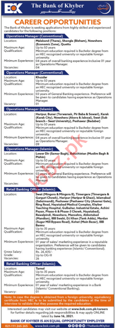 Vacancies in The Bank of Khyber BOK Advertisement June 2021