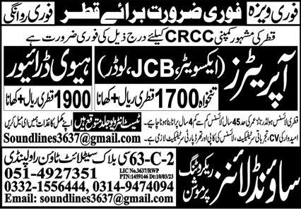 Vacant posts including heavy driver, loader operator, excavator operator and jcb operator are announced in Sound Lines Recruiting Promotion Qatar, qatar Qatar as per 14 March 2023 advertisement in daily Express Newspaper. Preferred Education is Intermediate, Middle and Matric etc.