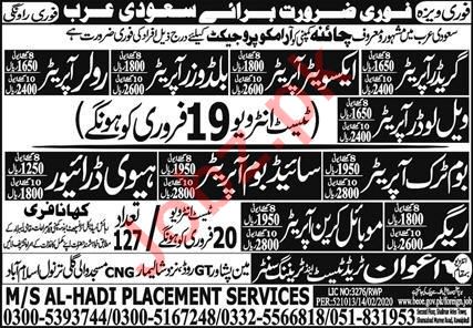 Grader Operator, Excavator Operator, Bulldozer Operator, Roller Operator, Wheel Loader Operator, Boom Truck Operator, Side Boom operator, Heavy Driver, HTV Driver, LTV Driver, Rigger, Mobile Crane Operator required for Saudi Arabia through M/S Al Hadi Placement Services Overseas Employment Promoters.