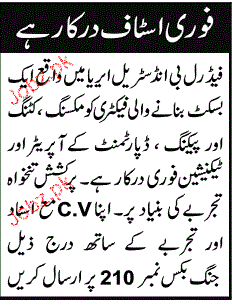 Apply as per details in job advertisement. Login to view further details of how to apply via https://www.jobz.pk online.