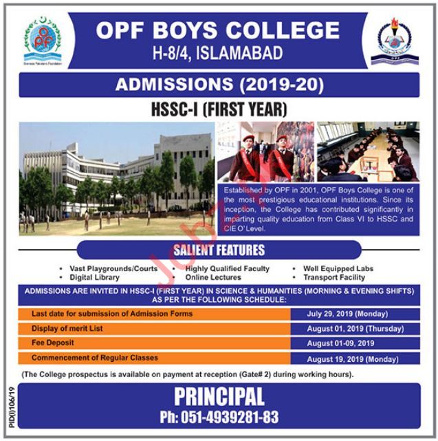OPF Boys College H-8/4 Islamabad, Pakistan are announced admissions fall 2019 for academic session 2019 to 2020 for the classes of FA Fine Arts & F Sc in Pre Medical and Pre Engineering, ICS. Read newspaper ad for exact details.