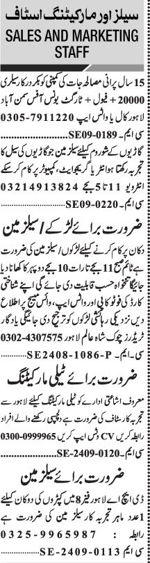 Private Company is looking for candidates for following posts as per job advertisement published in daily Jang Newspaper of September 10, 2024 for location Lahore, lahore Punjab Pakistan: