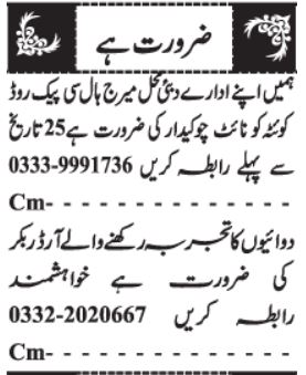 Private Company is looking for candidates for following posts as per job advertisement published in daily Jang Newspaper of April 25, 2025 for location Kasi Road Quetta, quetta Balochistan Pakistan:
