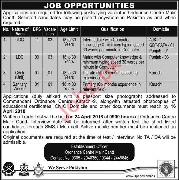 Ordnance Center Malir Cantt Karachi Jobs 2018 For LDC & UDC