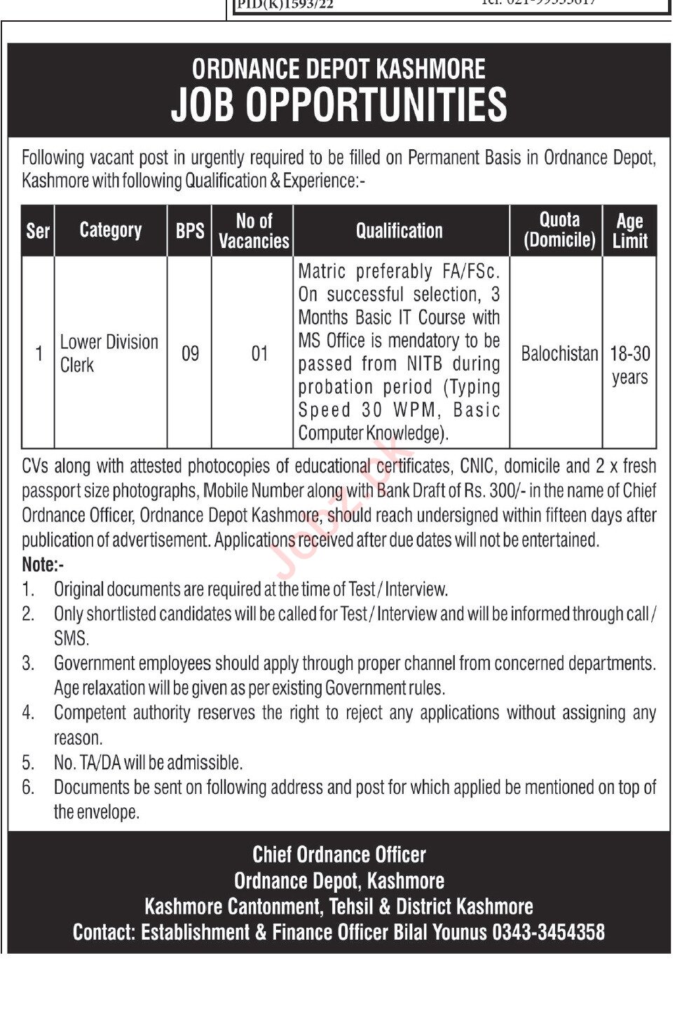 Ordnance Depot invites applications for job positions advertised in daily Express Tribune dated 4 December 2022 for following vacancies in Kashmore, kashmore Sindh Pakistan.
