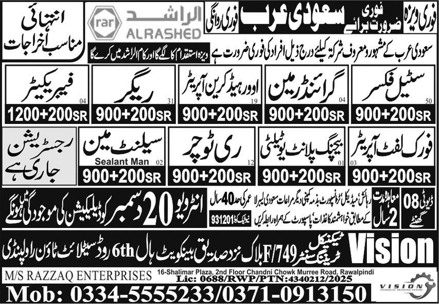 Vision Technical Training Center is looking for candidates for following posts as per job advertisement published in daily Express Newspaper of December 17, 2025 for location Dammam, taif Saudi Arabia:
