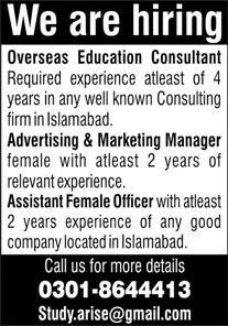 Vacant posts including marketing manager, advertising manager and assistant female officer are announced in Overseas Education Consultant Islamabad, islamabad Islamabad Pakistan as per 29 August 2022 advertisement in daily Express Newspaper. Persons with Master and Bachelor etc. education can apply.