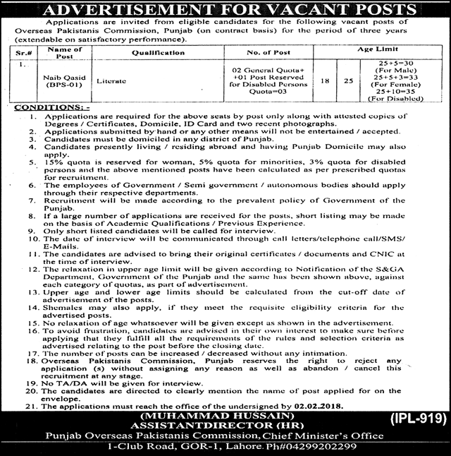 Overseas Pakistanis Commission OPC Jobs For Naib Qasid