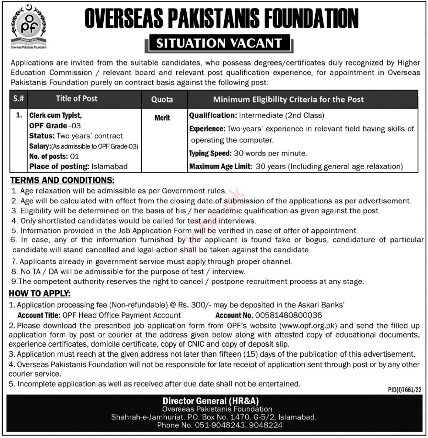 Vacant posts including clerk cum typist are announced in Overseas Pakistanis Foundation OPF Islamabad, islamabad Islamabad Pakistan as per 11 June 2023 advertisement in daily Express Tribune Newspaper. Persons with Intermediate etc. education can apply.