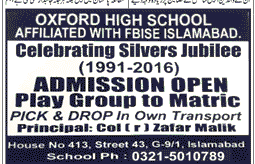 Oxford High School Admission in Play Group to Matric in Lahore. Read newspaper ad for exact details.
