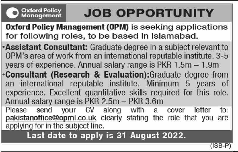 Vacant posts including assistant consultant, research consultant and evaluation consultant are announced in Oxford Policy Management Limited OPML Islamabad, islamabad Islamabad Pakistan as per 23 August 2022 advertisement in daily Dawn Newspaper. Educational qualifications required Bachelor etc.