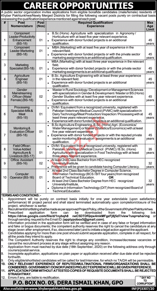 Public Sector Organization Dera Ismail Khan, Government of the KPK is seeking candidates for the posts of Component Leader, Component Leader Productivity Enhancement, Component Leader Marketing, Marketing Specialist, Agriculture Engineer, Gender Mainstreaming Officer, Processing Specialist, Monitoring Officer, Evaluation Officer, Field Officer, Field Officer Value Added Agriculture, Field Officer Livestock, Office Assistant, Computer Operator.