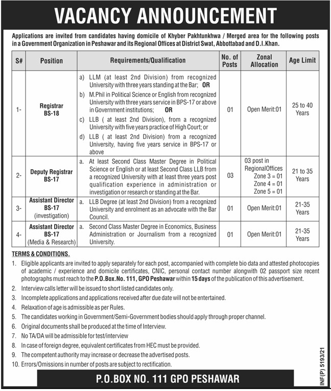 Government Organization Peshawar, Government of the KPK is seeking for the services from experienced candidates for the posts of Registrar, Deputy Registrar, Assistant Director, Assistant Director Investigation, Assistant Director Media, Assistant Director Research.