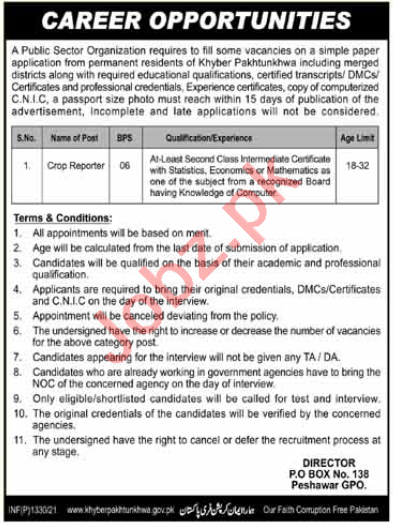 P O Box No 138 Peshawar GPO Jobs 2021 for Crop Reporter