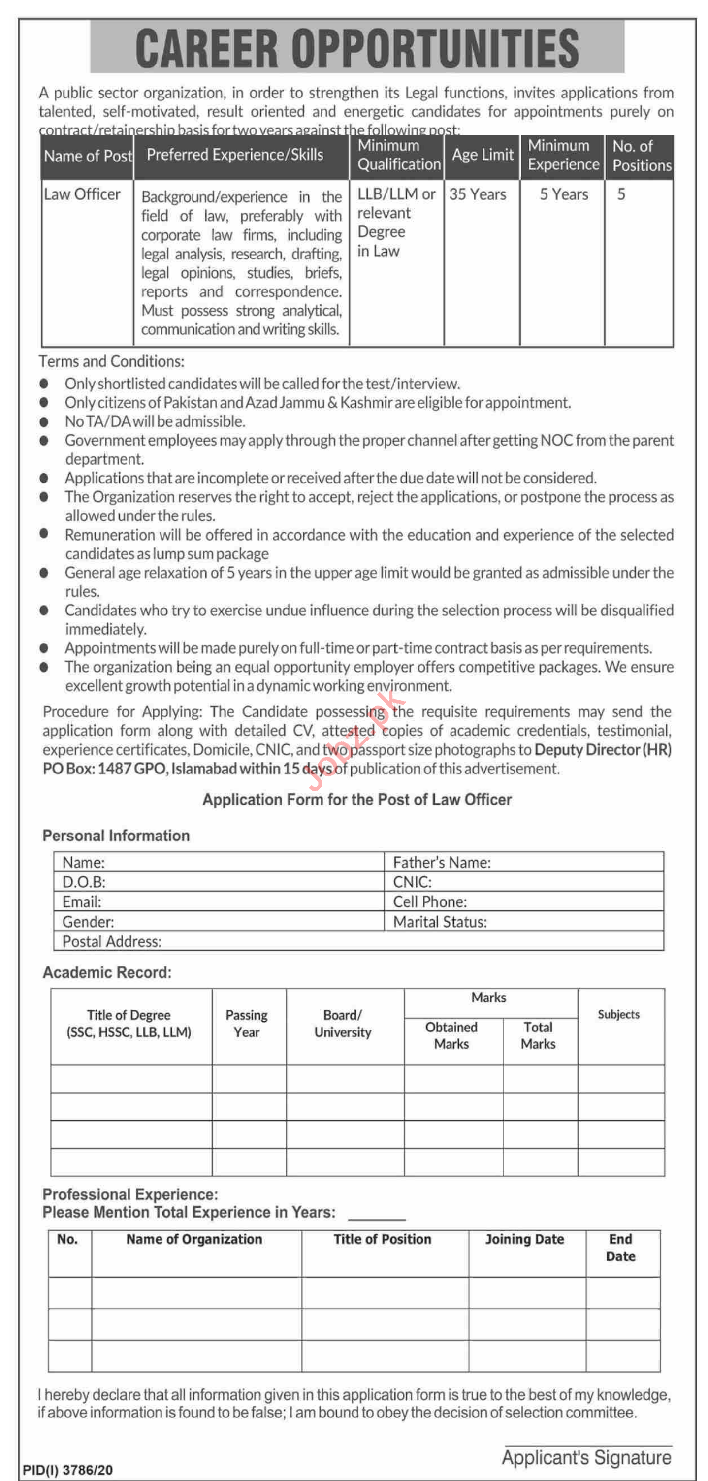 P O Box No 1487 GPO Islamabad Jobs 2021 for Law Officer